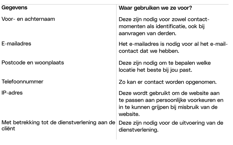 Wij gebruiken persoonsgegevens om contact met je op te kunnen nemen en voor het verder uitvoeren van de hulpvraag en dienstverlening. In onderstaand schema lees je welke persoonsgegevens we verwerken en waarom we dit doen.